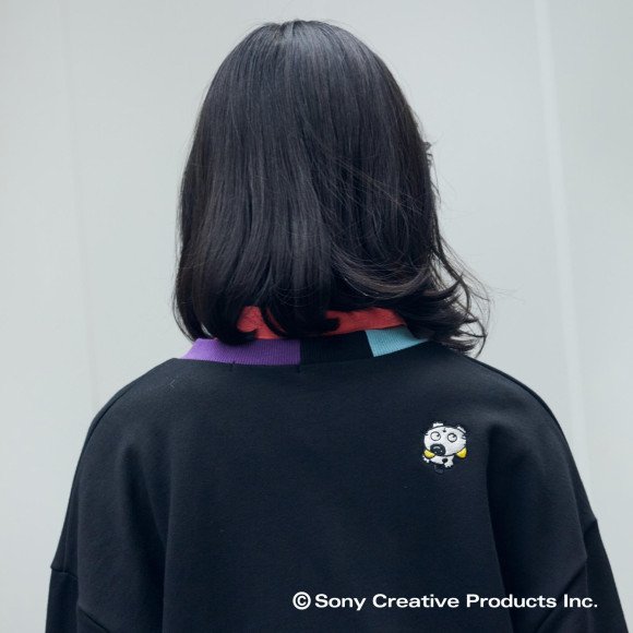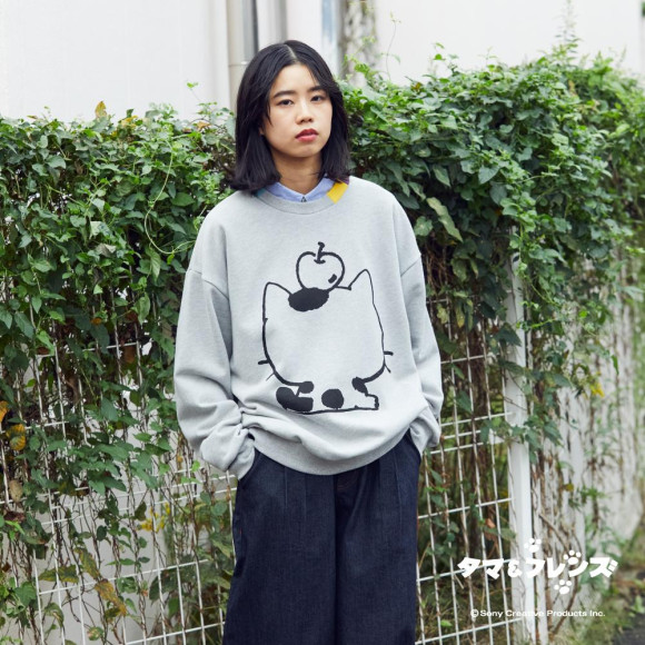 デザイン:リラックスシルエットのスウェット。前身頃には、あえて後姿のタマを大きくプリントしました。タマの頭の上にはリンゴが乗っていてユニーク。後身頃には、タマのカラー刺繍が入っているのがポイントです。