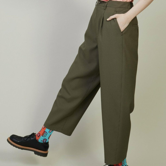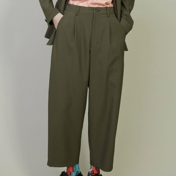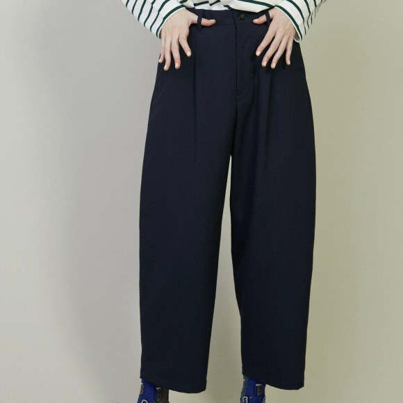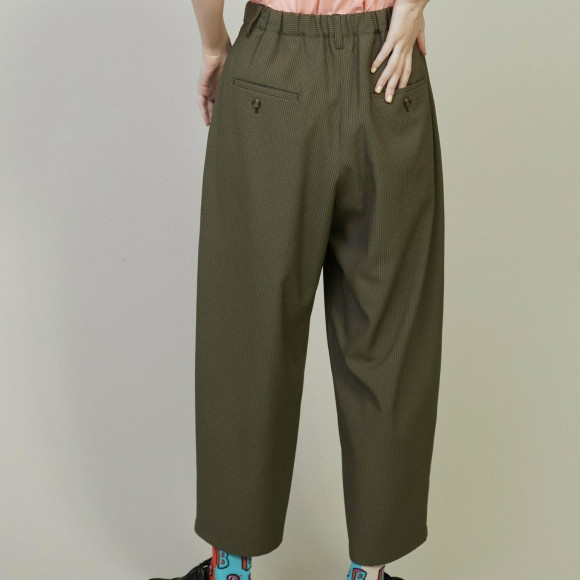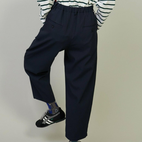 デザイン:フロントはタックを取りしっかりした印象を作りながらも、ヒップや太ももにかけてゆとりを持たせて裾に向かって緩やかなテーパードになったシルエット。やや短めのクロップド丈が軽やかさを演出しています。同素材のジャケットと合わせてセットアップとしても楽しめます。