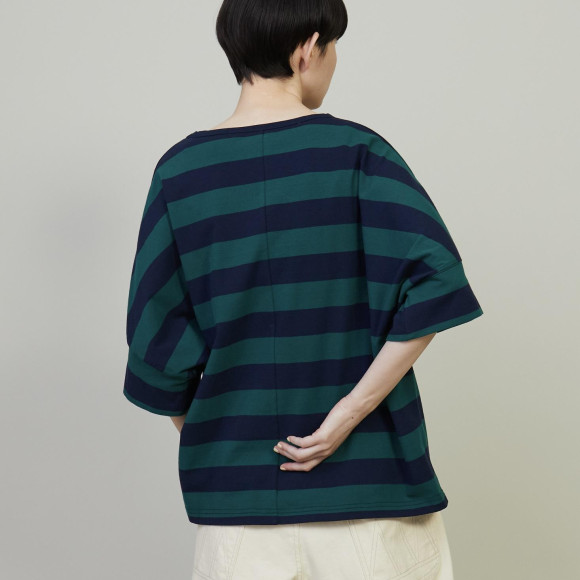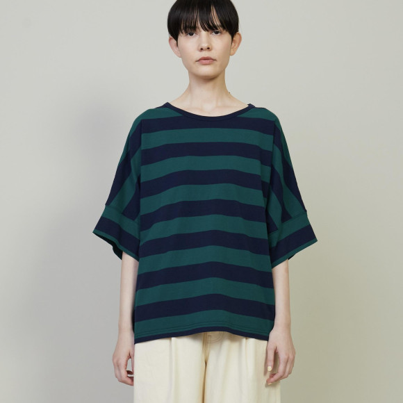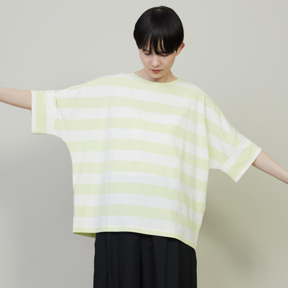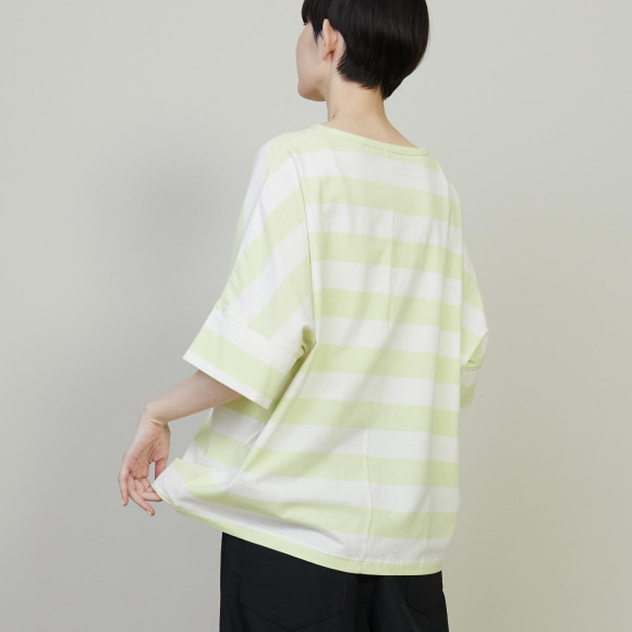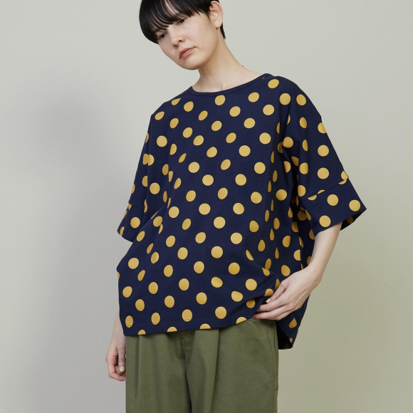 素材:太幅のボーダー生地とオリジナルのドット柄をプリントした天竺素材。