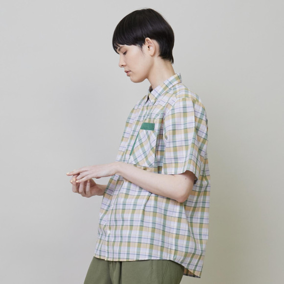 素材:色の並び方や位置、柄の大きさなど細部にもこだわってつくったオリジナルのマドラス風のシャツ生地。部分的に発色の良い無地の生地を組み合わせています。