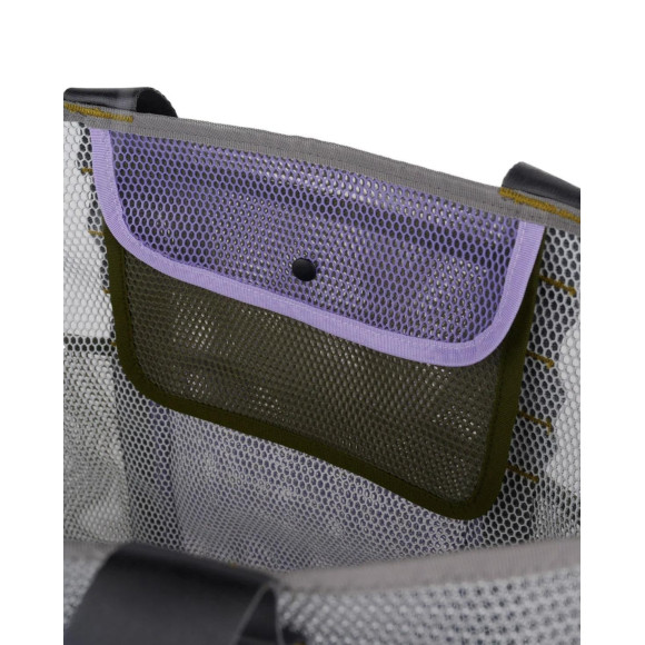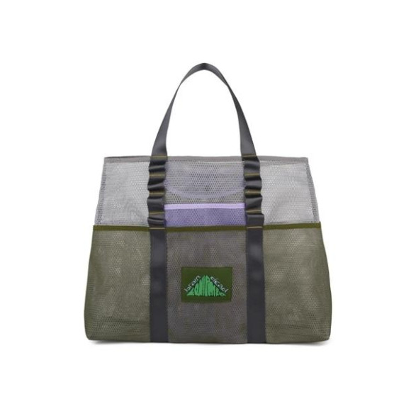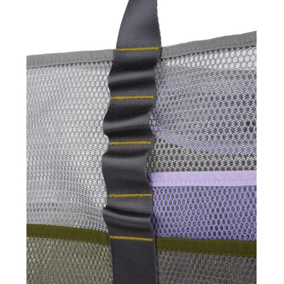 ナイロンウェビングのキャリーストラップ付きメッシュトートバッグ。 開閉可能な内ポケット、外ポケット、フロントのBrain Dead Equipmentロゴが特徴