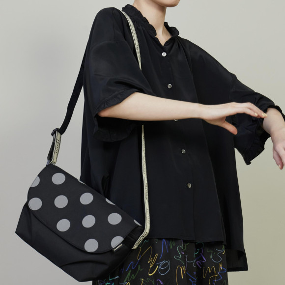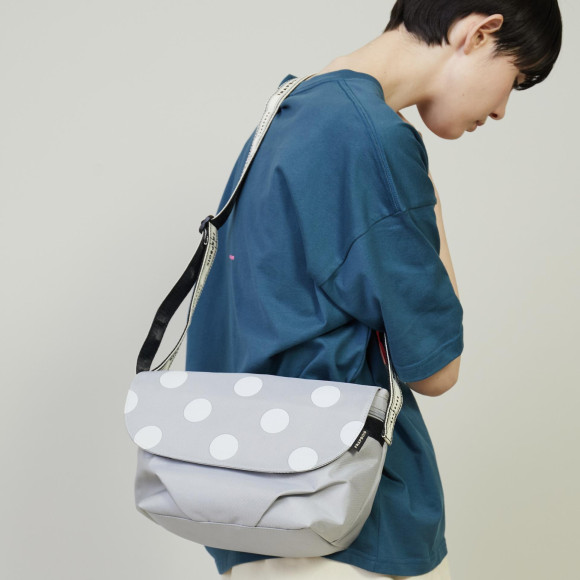 デザイン:程よい大きさのメッセンジャーバッグは肩紐のロゴテープがインパクトをつくっています。フロントのドットプリントも反射材(リフレクト)プリントで光を反射させます。