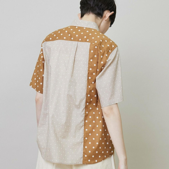 デザイン:ベーシックなシャツブラウスはタイト過ぎない程よいユトリと堅すぎない柔らかな印象に仕上げています。大胆に2種類の生地を使いながらも色のトーンを合わせることで馴染みの良い印象に仕上げています。