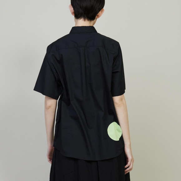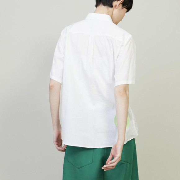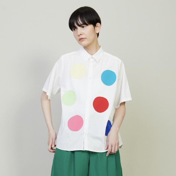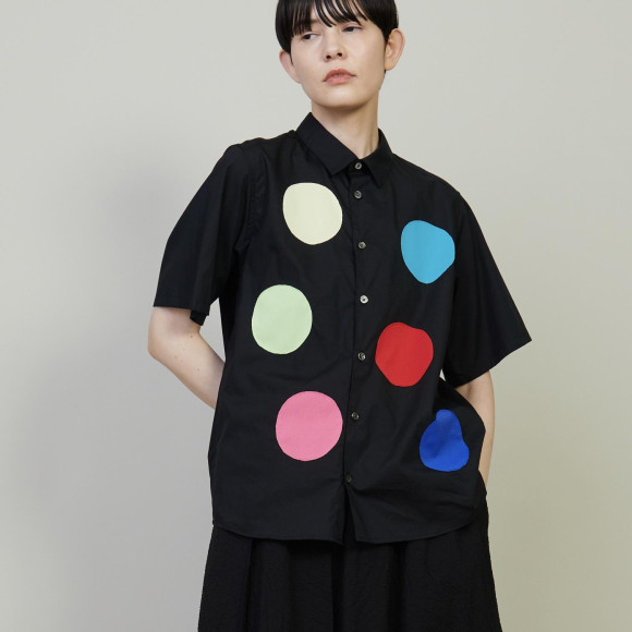 デザイン:ベーシックなシャツは程よいユトリのリラックス感が特徴。フロントにカラフルなトリコット素材を丸くパーツでくりぬき、それを配置したデザイン。トリコットの端はあえて断ち切りにして立体感を出しています。