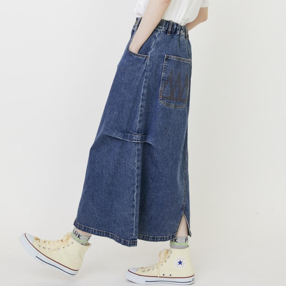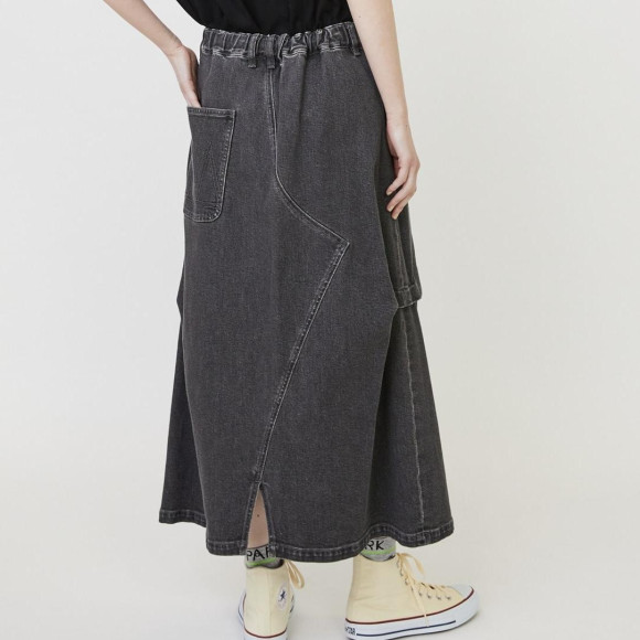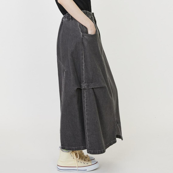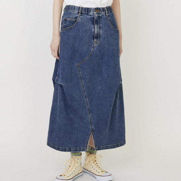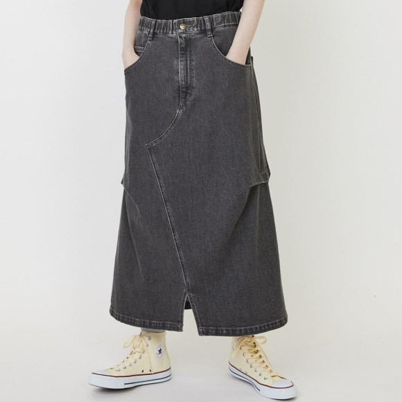 デザイン:デニムパンツを解体してリメイクしたかのようなユニークな切り替えが目を引くデニムスカート。程良いゆとりながらスッキリとしたナローシルエットに脇にタックを取りアクセントをつくっています。ウエストもゴムとヒモでイージーなところも嬉しいポイントになっています。