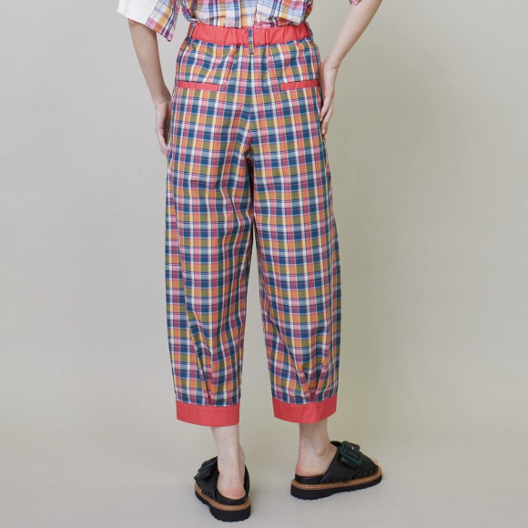素材:色の並び方や位置、柄の大きさなど細部にもこだわってつくったオリジナルのマドラス風のシャツ生地。部分的に発色の良い無地の生地を組み合わせています。