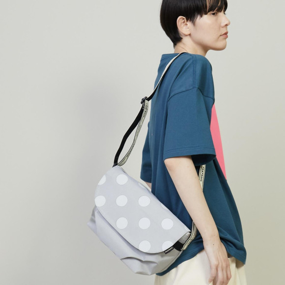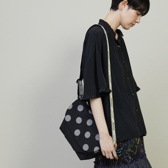 デザイン:程よい大きさのメッセンジャーバッグは肩紐のロゴテープがインパクトをつくっています。フロントのドットプリントも反射材(リフレクト)プリントで光を反射させます。