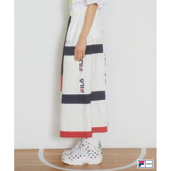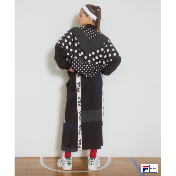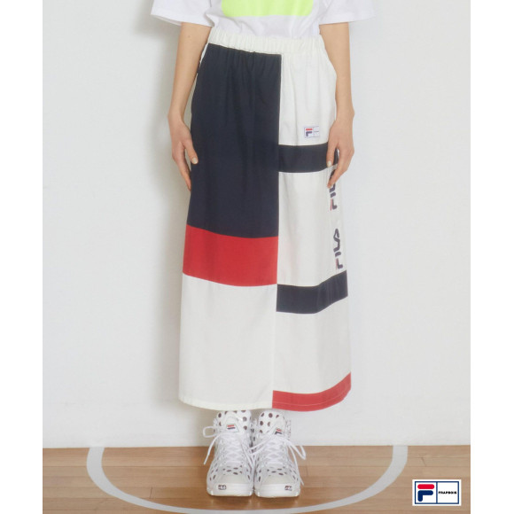 デザイン:ゆったりとしたエアリーなAラインのスカートをベースに大胆に切り替えを入れてからブロックに組み合わせています。部分的にロゴをテープ状にプリントしてスポーティーな雰囲気を出しています。ウエストがゴムとヒモでイージーな仕立てなのも◎。