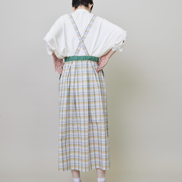 デザイン:フロントに大きくとったタックで膨らみを出したスカートはアクセントのサスペンダーモチーフが効いています。取り外しのできるサスペンダーなので、スカート単体としても着用が可能です。