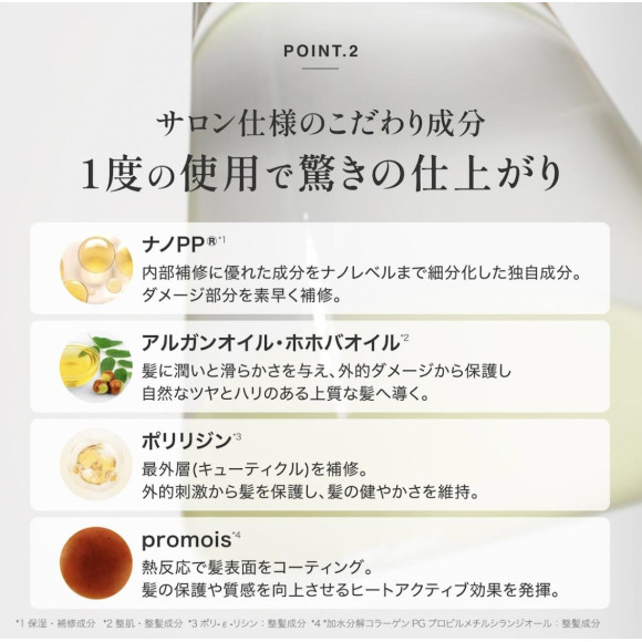 髪内部に素早く浸透し、シャンプー後も髪内部に残るため、使う度毛髪の補修効果・髪本来の保湿力がアップします。