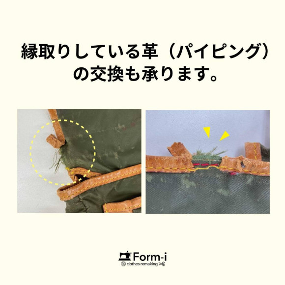 その他、縁取りしている革パイピングの修理も承ります。部分補修や全交換など、お気軽にご相談ください。
