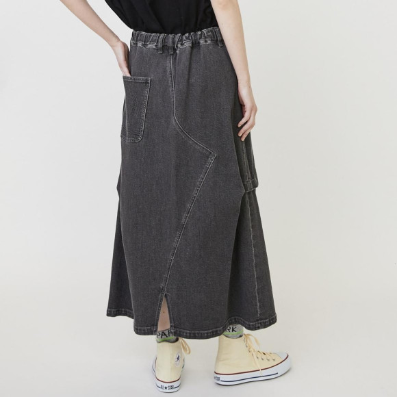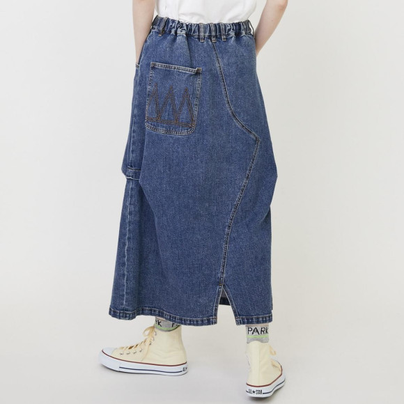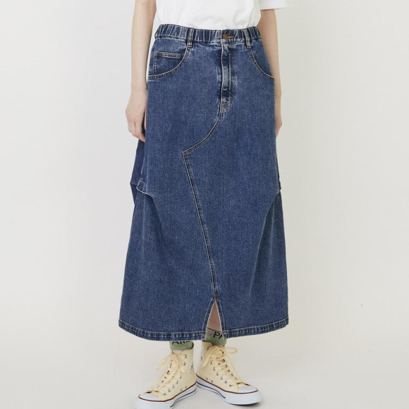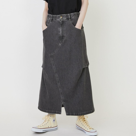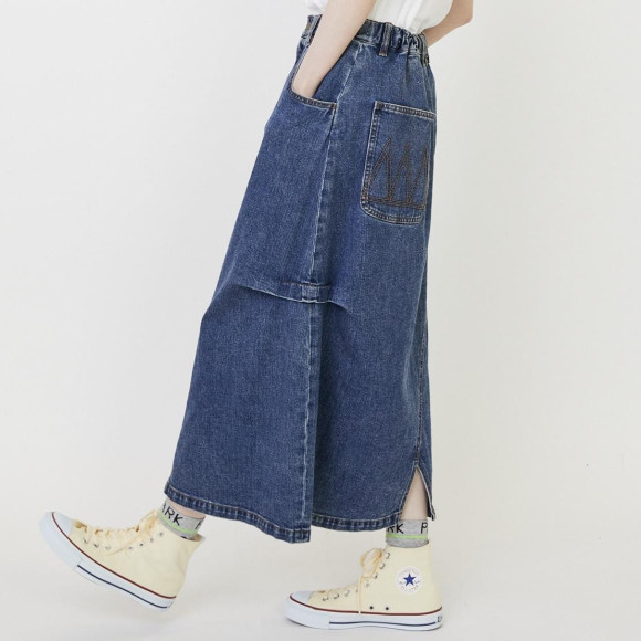 デザイン:デニムパンツを解体してリメイクしたかのようなユニークな切り替えが目を引くデニムスカート。程良いゆとりながらスッキリとしたナローシルエットに脇にタックを取りアクセントをつくっています。ウエストもゴムとヒモでイージーなところも嬉しいポイントになっています。