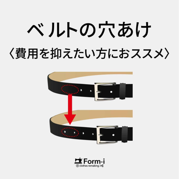 また、費用を抑えたい!という方には、ベルトの「穴あけ」も承ります。(穴が増える分、バックルも内側に入りますので剣先側が長くなります。全体的なバランスを変えたくない方にはベルトカットがお薦めです)