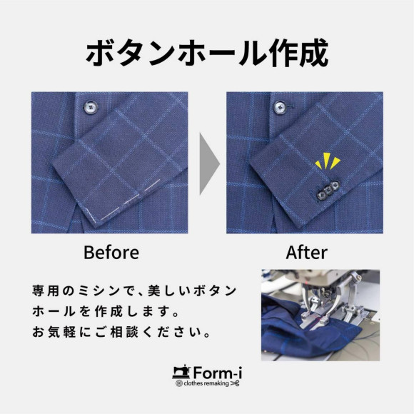 また、袖丈が仕上がっていない状態のジャケットに “ボタンホール” を入れることもできます。専用ミシンを使って、ひとつひとつ丁寧にボタンホールを作成いたします。袖口にボタンホールを入れると、見た目がぐっと上品になって、着こなしの幅も広がります。ぜひ、ご利用ください。