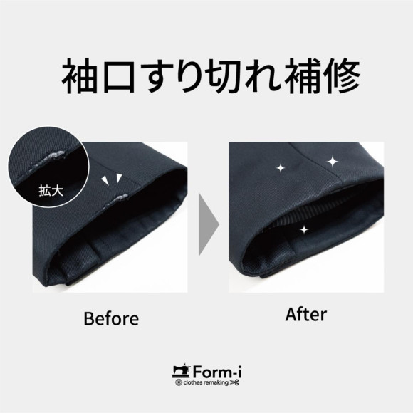 その他、袖口の擦り切れ補修も承ります。時計などが当たって袖口が破れたりしたお洋服もお気軽にお持ち込みください。
