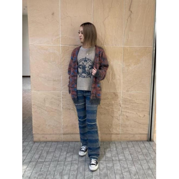 総柄のカーディガンは色味が落ち着いている為、組み合わせの幅が広く普段使いに着回しやすい羽織です!