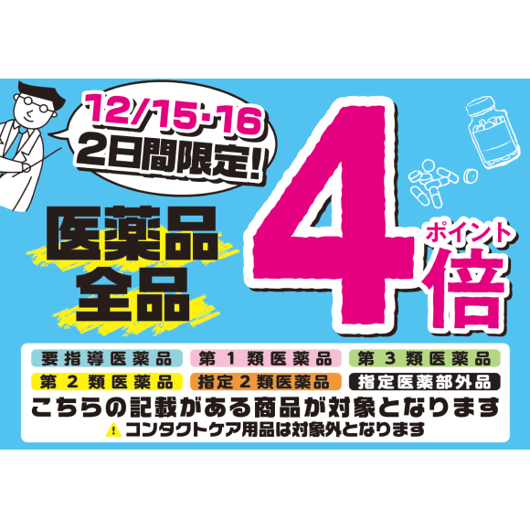 12/15(月)・16(火) 医薬品ポイント4倍・最大20%還元!