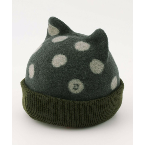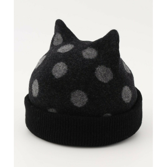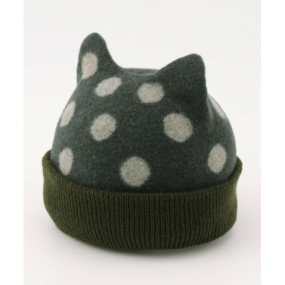 【デザイン】人気の猫耳シリーズのドット柄を別注したアイテム。リブ部分はサラッとした肌触りで帽子全体はウールのニット地を縮絨した温かみのある表情がポイント。色目を抑えて被りやすくしています。
