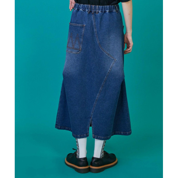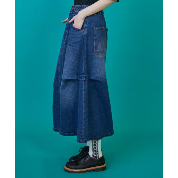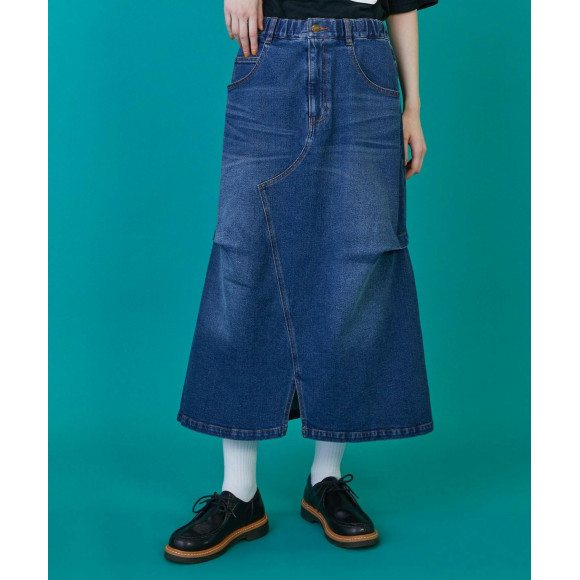 【デザイン】デニムパンツを解体してリメイクしたかのようなユニークな切り替えが目を引くデニムスカート。程良いゆとりながらスッキリとしたナローシルエットに脇にタックを取りアクセントをつくっています。ウエストもゴムとヒモでイージーなところも嬉しいポイントになっています。