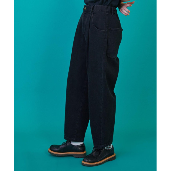 【素材】ざっくりとした表面感ながらキレイな綾目が立ったデニム素材は見た目のしっかり感に加えストレッチが効いているので履きやすい点がポイントです。ブルーは本格的な加工感を入れています。ブラックは程よく着古したような洗い加工を入れたオールブラックのシックな雰囲気です。