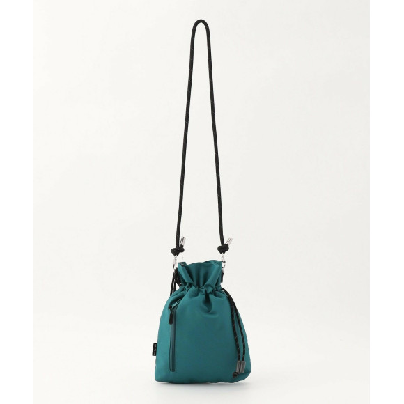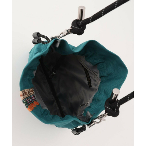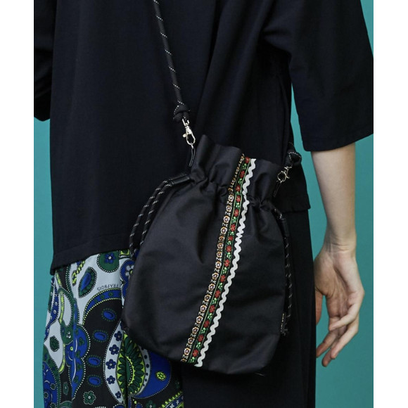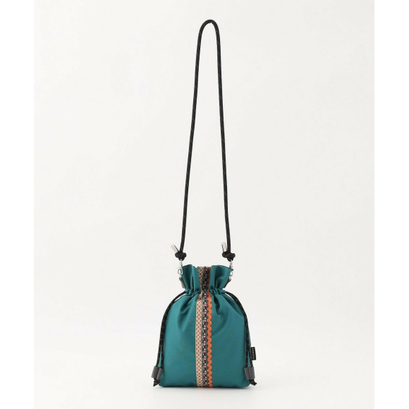 【デザイン】巾着型のミニサコッシュは片面には3種類のテープがアクセントを作り、別側にはファスナーが付いて、巾着を開けないでも中にアクセス出来る機能性が◎。肩紐のザイルコードもシンプルな中にも程よいアクセントをつくっています。