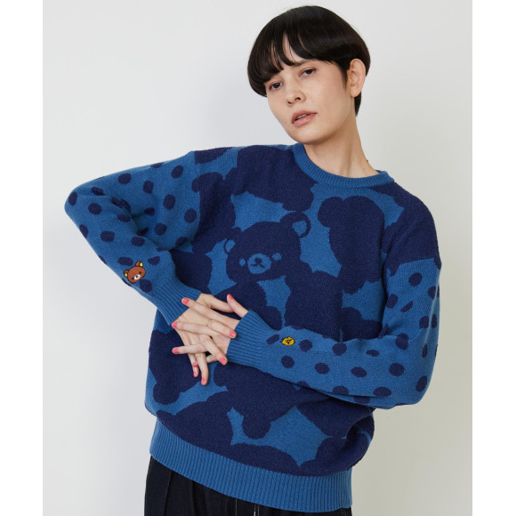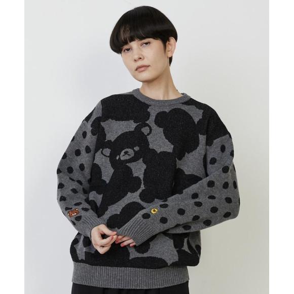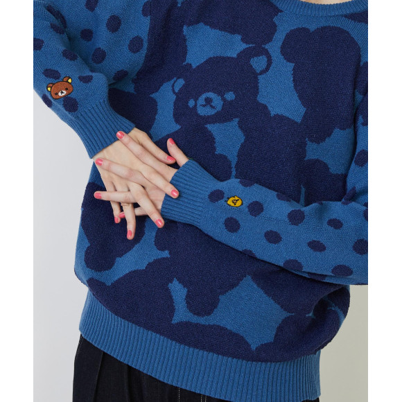 【デザイン】前身頃に「リラックマ」の総柄をダブルジャカードで編み立てました。
