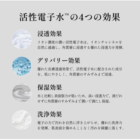 イオン濃度の高い活性電子水は、優れた浸透力でイオンチャネルを自然に通過し、角質層に潤いと成分をしっかりと届けます。