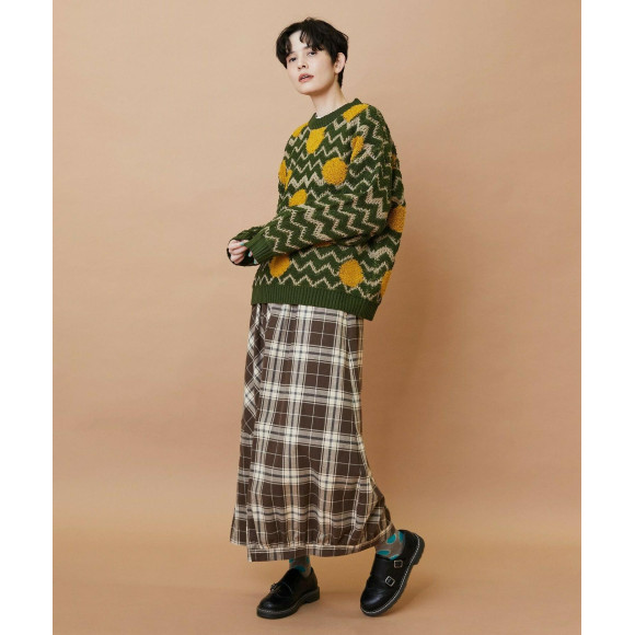 シンプルなフレアーベースながらチェック柄のパッチワークのようにも見えるデザインでインパクトを作っています。