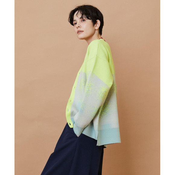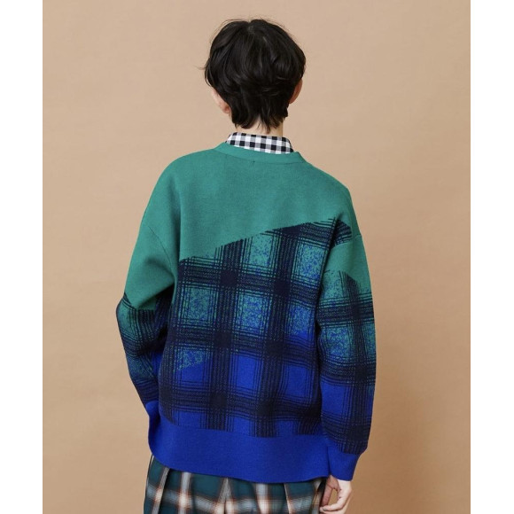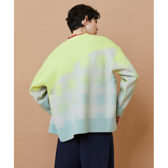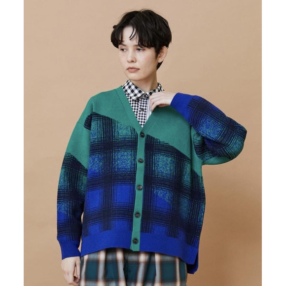 【デザイン】ゆったりとしたリラックスシルエットのカーディガンをベースにチェック柄がかすれたようなイメージで編み上げたデザインになっています。