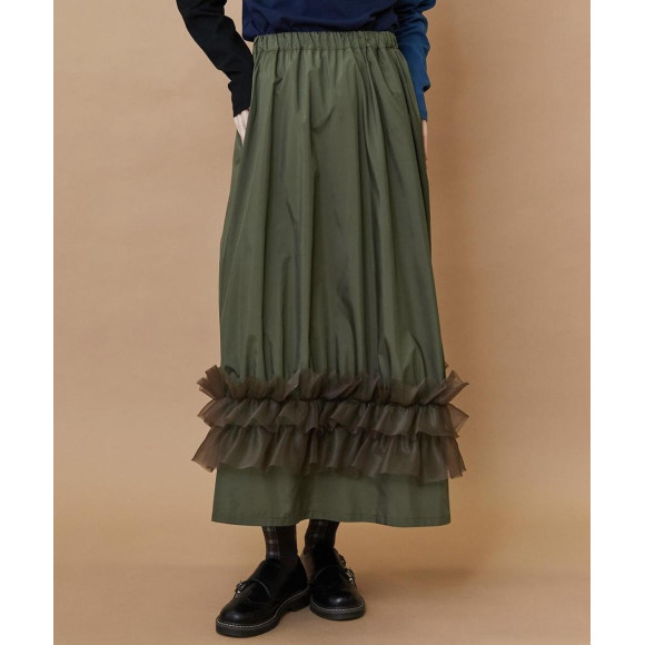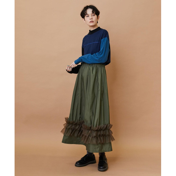 スポーティーな素材に透けと軽さのオーガンジーの組み合わせがモードな雰囲気に仕上がっています。