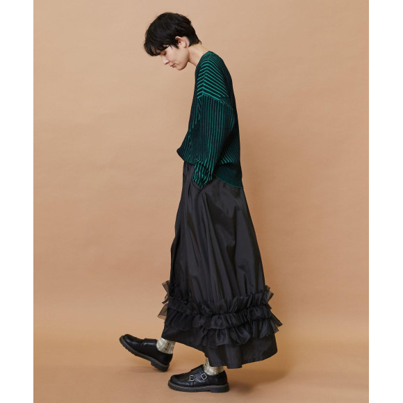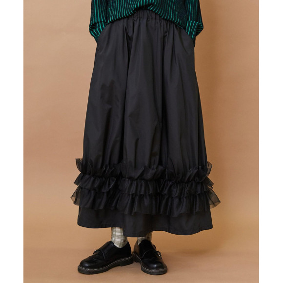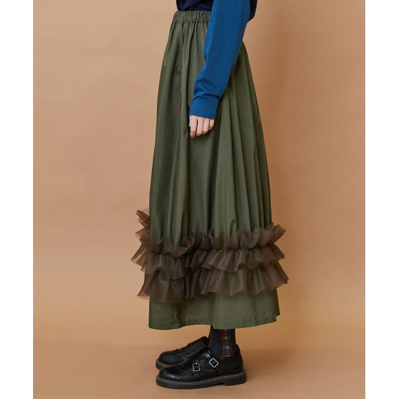 裾部分に立体的なヒダが繊細さを出したオーガンジー素材を組み合わせています。