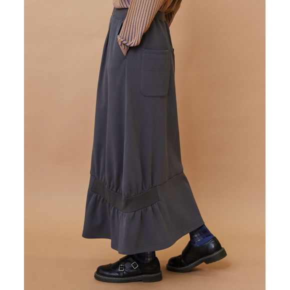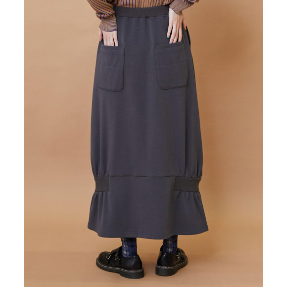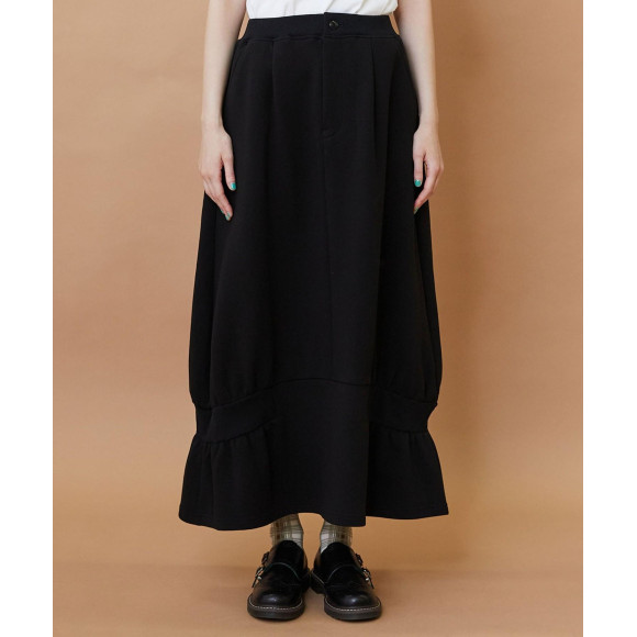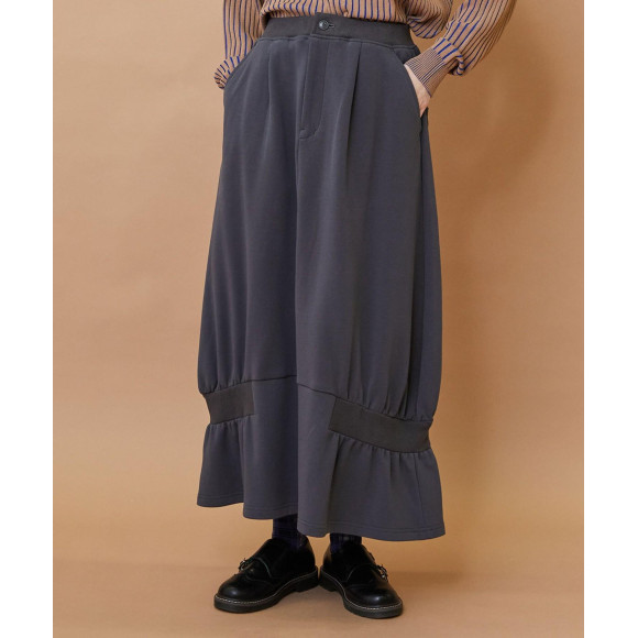 【デザイン】ウエストはリブでイージーな作りになったコクーンシルエットのデザインスカート。