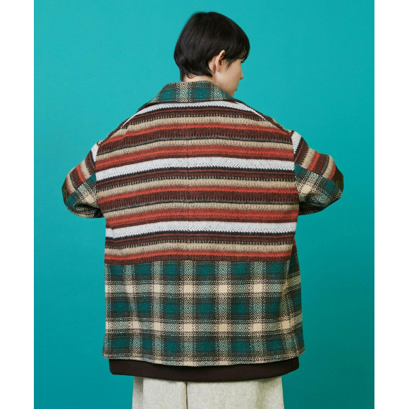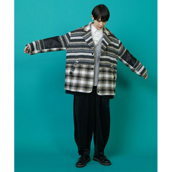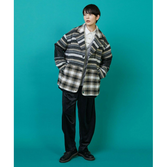 大胆な切り替えと柄の複雑な組み合わせでインパクトのあるデザインに仕上がっています。ブルゾンのようなリブの使い方やラペルを止めると衿の表情が変化するなど細かなギミックが満載です。