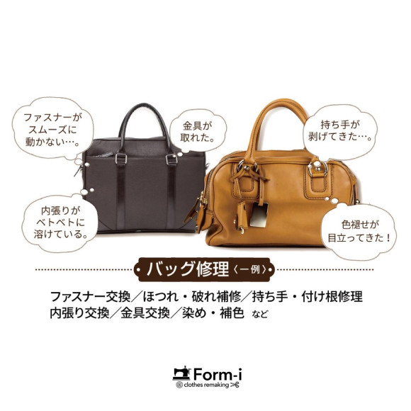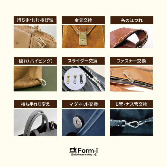 ●ファスナー修理●持ち手カット&作り替え●付け根修理●コバ塗り●ほつれ・破れ補修●パイピング修理●スナップ・ハトメ・カシメ交換●マグネット交換●D管・ナス管交換●ビス・ネジ交換●底びょう●内張り交換など