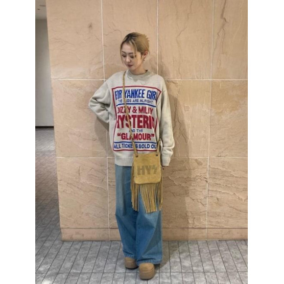 ヒスらしいグラフィックのニットは軽く春先まで使えます!シンプルになりがちなコーディネートにデザイン性のあるバッグ合わせがお気に入りです!