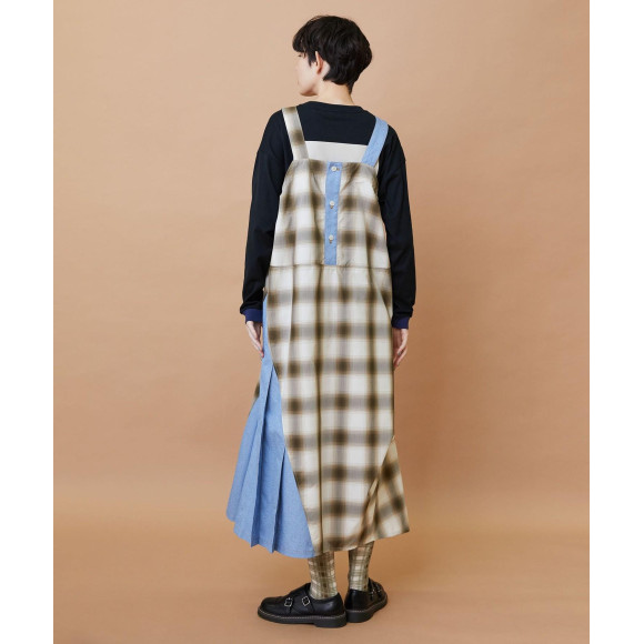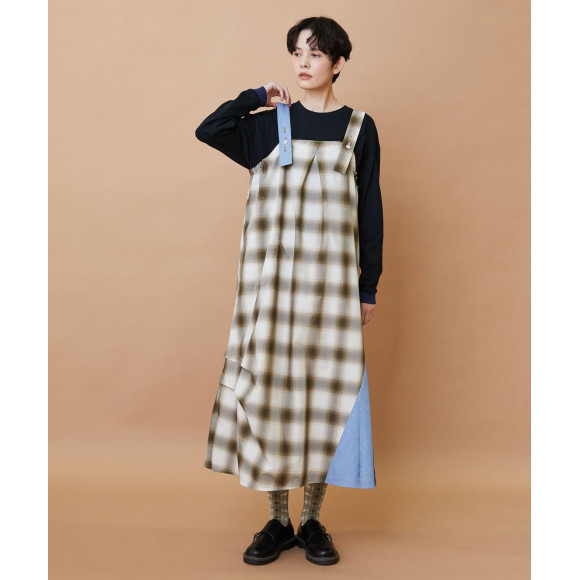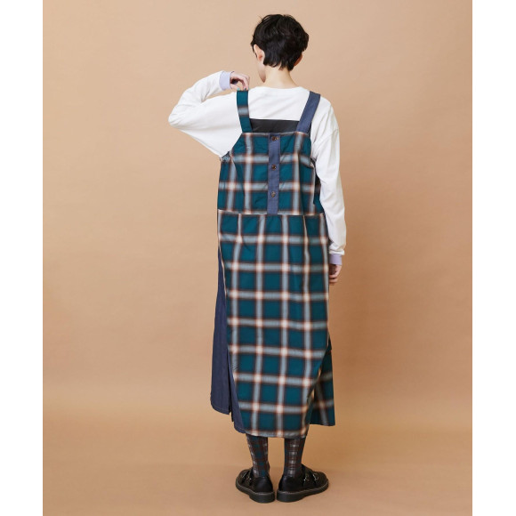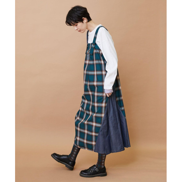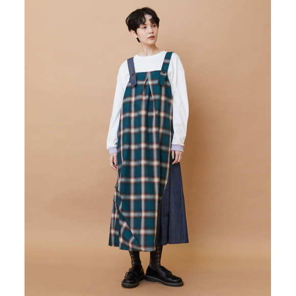 【デザイン】オンブレーチェックの素材とデニム調の素材を組み合わせたジャンパースカート。