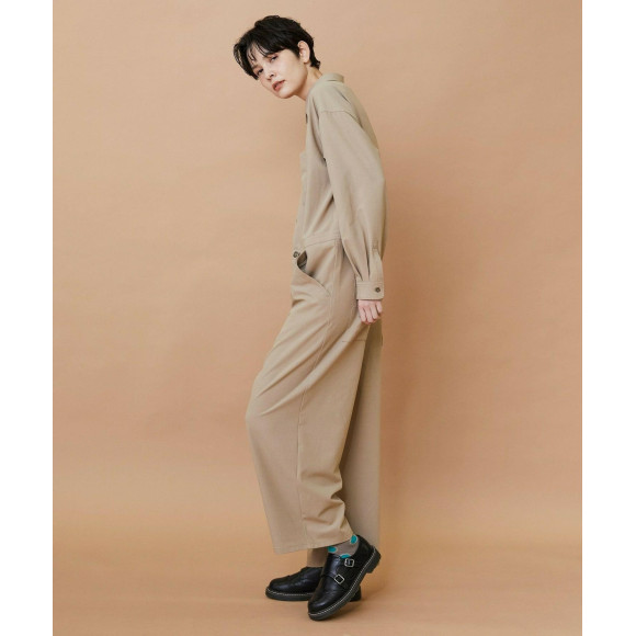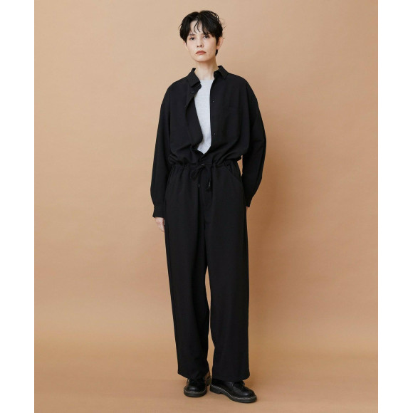 上半身はゆったりとしたオーバーシャツをベースにパンツ部分が緩やかなワイドテーパードシルエットに仕上げたオールインワンアイテム。