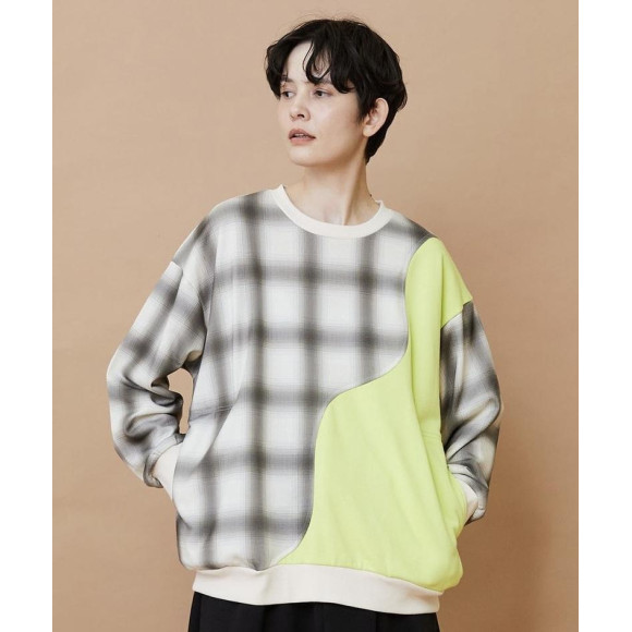 【デザイン】オンブレーチェックを大胆にプリントした生地と無地の生地をスカラップ状に組み合わせたインパクトのあるデザイン。
