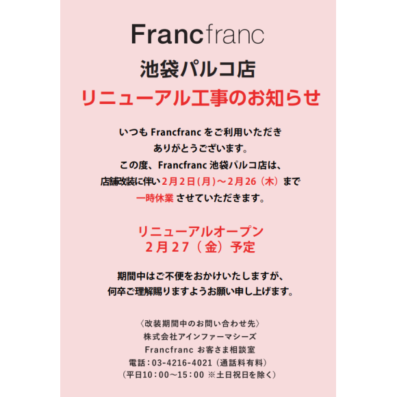 この度Francfranc池袋パルコ店は、誠に勝手ながら店舗改装に伴い2/2(月)~2/26(木)まで一時休業とさせて頂きます。