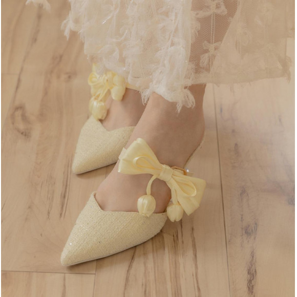 チューリップモチーフのリボンデザインが印象的なミュールパンプス。