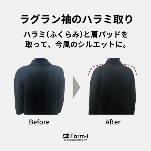また、昔のコートの分厚い肩パッドを薄いものに交換したり、それでも大きい場合は生地をカットしてお袖のボリュームを減らすお直しもございます。