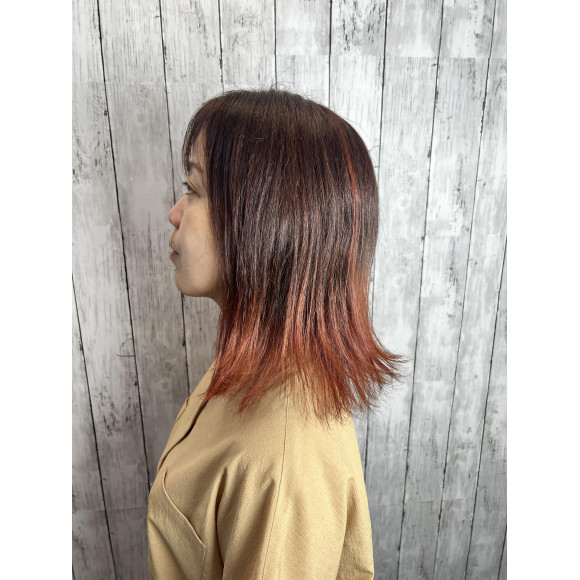 レッド系にしてほしいとのオーダーだったので、ブリーチでグラデーションを作ってからレッドオレンジベージュを重ねました☆