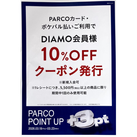 池袋パルコ店では、DIANA会員様(新規入会も◎)に限り、ポケパル決済・PARCOカードご利用で、10%OFFクーポンが使用できます!