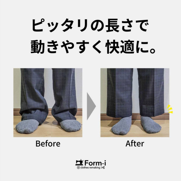 ズボンの丈も短く感じられるようなら、お直しで調整することができます。(※丈を伸ばす際には、裾の折り返し部分の生地が必要となります)