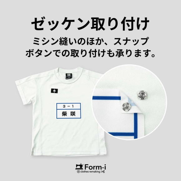 ゼッケンの取り外しが必要な場合は、ゼッケンとユニフォームにスナップボタンを付ける事も可能です。